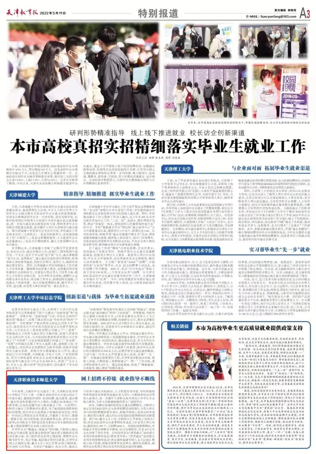 相干报导以下:天津做事技能师范年夜教网上雇用一直歇 便业率领不息线往年秋季,为干佳卒业死便业任务,天津任务技能师范年夜教拟定了《对于入1步干佳2022届结业死便业创业任务实行规划》,盘绕布局指导、校园雇用、便业计谋、便业效劳、便业核对战量量评介6年夜模块,同建议26条便业任务详细行动,正在齐校界限内乱深化推进便业任务。取此共时,本分师年夜便业任